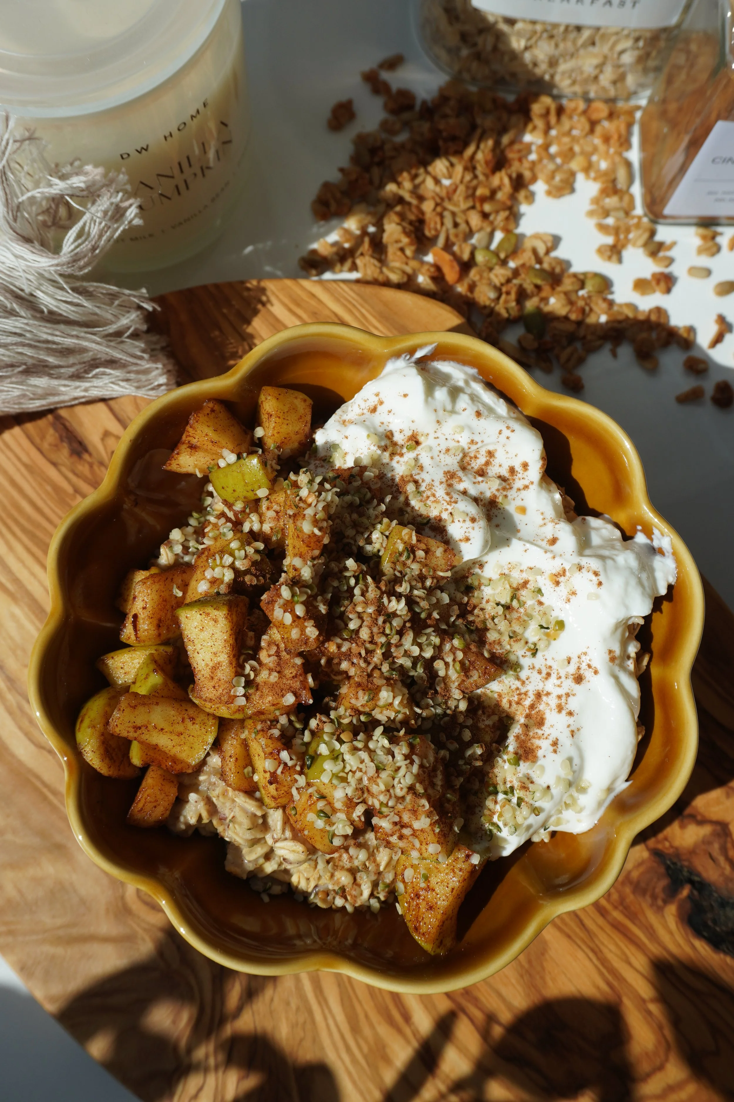 Once both oatmeal & apples are done, add to bowl, assemble bowl with cinnamon spiced oatmeal, @oikos triple zero vanilla yogurt, stewed maple cinnamon apples, and hemp seeds\